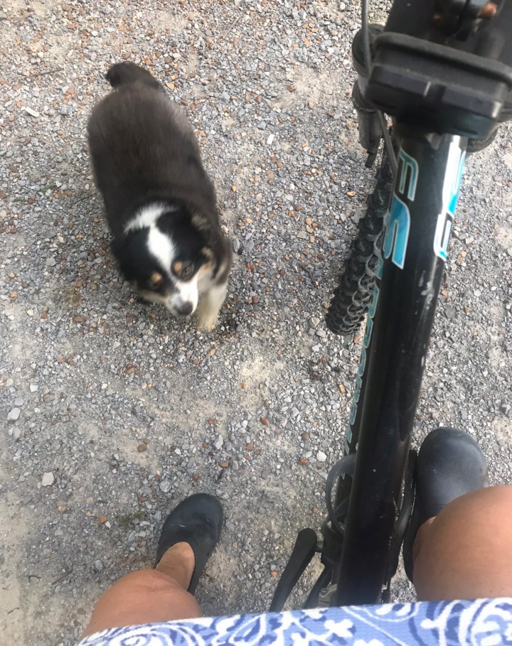 Riding my bike is often the best break I know. It gets me outside and moving and that day, it was away from the house where everything was dark and dismal. Darlin’ danced when she saw me getting on my bike and raced ahead, stopping to turn ’round and ’round, delighted. Was that a smile? I swear, sometimes I think she smiles at me. I definitely saw teeth.
