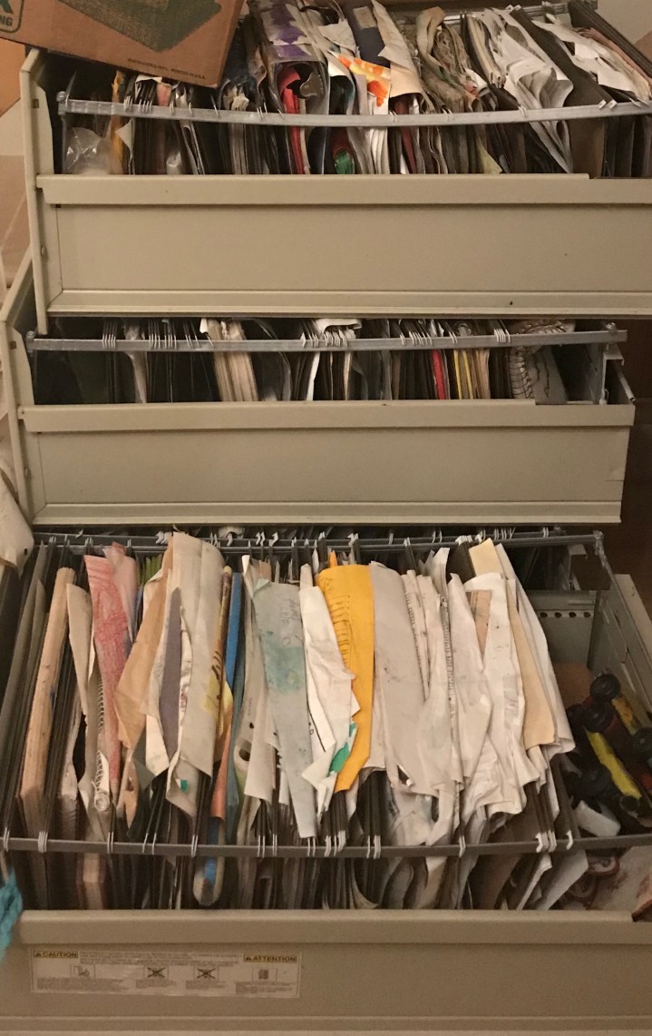Here were stacked the spilling boxes and drawers of drawings, letters from camp, “best” and “most” awards, and other mementos from five childhoods. There were also boxes-times-boxes of clothing, turned over time into Nike swooshed and ruffled mice nurseries, hole-y and wholly unusable with their dry rotted elastic and scratchy, non stretch fabric. The clothes and the mice droppings were easy to toss as I went through them.
