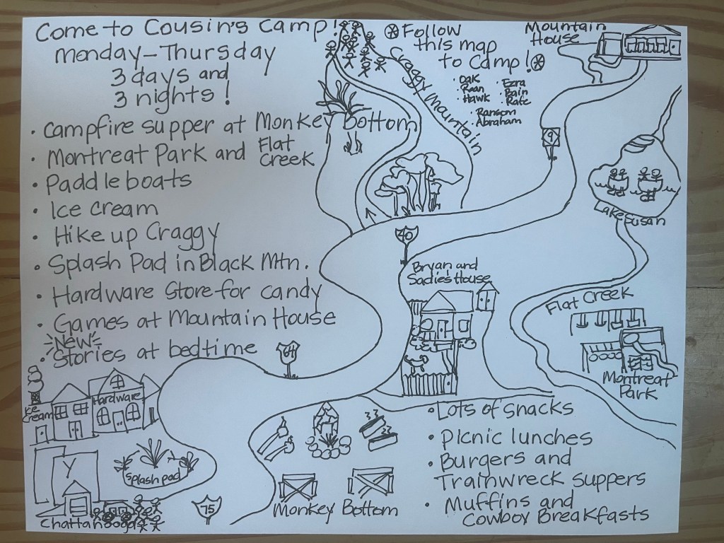 I pitched it to the parents who all agreed. The grands were overjoyed. The idea included meeting up with daughter Sadie and her boys, who live in nearby Black Mountain, so all eight cousins would be together. She and I came up with a plan, and I drew a map of it and mailed it to each boy.